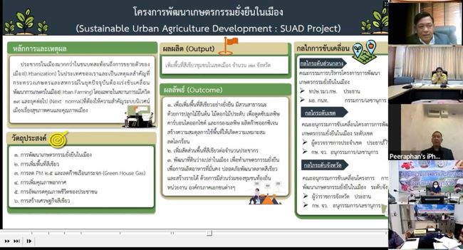 วันนี้ (25 ก.พ.65) นายอลงกรณ์ พลบุตร ที่ปรึกษารัฐมนตรีว่าการกระทรวงเกษตรและสหกรณ์ ในฐานะประธานคณะกรรมการบริหารโครงการการพัฒนาเกษตรกรรมยั่งยืนในเมือง (Sustainable Urban Agriculture Development Project : SUAD Project) เป็นประธานการประชุมแนวทางการดำเนินงานโครงการการพัฒนาเกษตรกรรมยั่งยืนในเมืองระดับเขต และระดับจังหวัด ทั่วประเทศผ่านระบบการประชุมทางไกลออนไลน์ zoom cloud meeting พร้อมด้วย นายอภัย สุทธิสังข์ หัวหน้าผู้ตรวจราชการกระทรวงเกษตรและสหกรณ์ ผู้ตรวจราชการประจำเขตตรวจราชการทุกท่าน และเกษตรและสหกรณ์จังหวัดทั่วประเทศ เข้าร่วมประชุม โดยมี นายจิตติศักดิ์ ศรีปัญญา ผู้อำนวยการกองนโยบายเทคโนโลยีเพื่อการเกษตรและเกษตรกรรมยั่งยืน (กนท.) สป.กษ. เป็นเลขานุการการประชุม ทั้งนี้ที่ประชุมได้พิจารณาและเห็นชอบแนวทางการดำเนินงานโครงการการพัฒนาเกษตรกรรมยั่งยืนในเมือง ระดับเขต และระดับจังหวัด